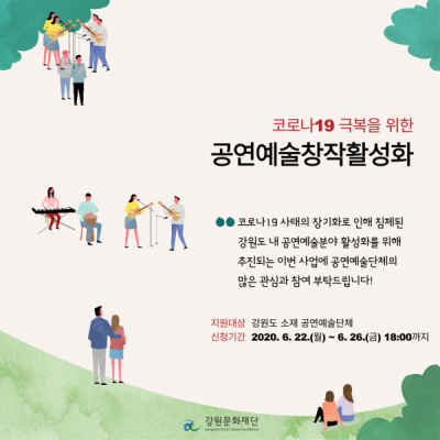 [충청뉴스큐] 강원문화재단은 코로나19 사태 장기화로 창작·발표활동에 어려움을 겪고 있는 지역 공연예술단체의 피해경감과 재도약 기반 마련을 위해 ‘코로나19 극복을 위한 공연예술창작활성화’사업을 추진한다.