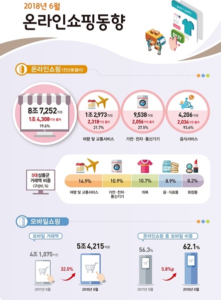 [충청뉴스Q] 2018년 6월 온라인쇼핑 거래액은 전년동월대비 19.6% 증가한 8조 7,252억원 수준이며, 온라인쇼핑 거래액 중 모바일쇼핑은 32.0% 증가한 5조 4,215억원을 기록했다.