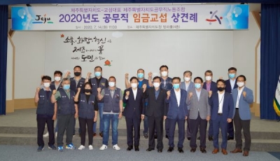 [충청뉴스큐] 제주특별자치도는 14일 오전 11시 도청 4층 탐라홀에서 제주도공무직노동조합과 2020년도 임금협약 체결을 위한 상견례를 개최했다.