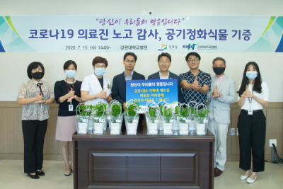 [충청뉴스큐] 강원도는 코로나19 극복에 애쓰고 있는 강원대학교병원 의료진에게 공기정화식물을 심은 화분 100개를 전달하면서 감사의 마음을 전했다.