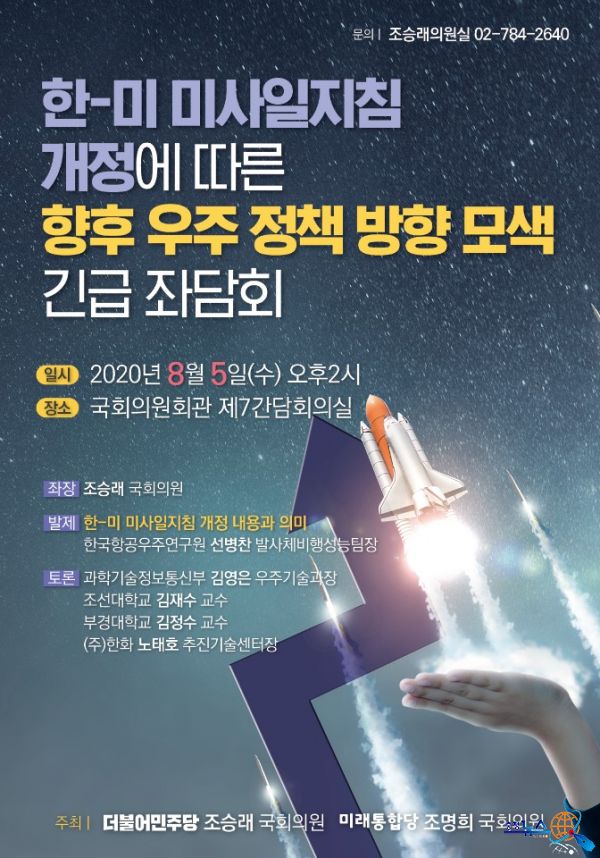 조승래 국회의원(더불어민주당, 대전 유성구갑)이 조명희 국회의원(미래통합당, 비례대표)과 함께 ‘한-미 미사일지침 개정에 따른 향후 우주 정책 방향 모색 긴급 좌담회’를 개최한다“고 밝혔다. 국회의원회관 제7간담회의실에서 5일(수요일) 오후 2시에 진행되는 이번 좌담회는 한-미 미사일지침 개정으로 우주발사체 고체연료 제한이 해제되는 등 우주산업 연구개발 환경이 변화함에 따라 이에 따른 정책적 대안 등을 모색하기 위해 마련됐다. 긴급 좌담회는 먼저 한국항공우주연구원 선병찬 발사체비행성능팀장이 발제를 맡아 ‘한-미 미사일지침 개정 내용과 의미’에 대해 발표할 예정이며, 토론자로 △ 과학기술정보통신부 김영은 우주기술과장 △ 조선대학교 김재수 교수 △부경대학교 김정수 교수 △ ㈜한화 노태호 추진기술센터장 등이 참여할 예정이다. 이번 긴급좌담회의 공동주최자이자 좌장을 맡은 조승래 의원은 “한-미 미사일지침 개정으로 우주 발사체에 고체연료를 사용할 수 있게 되어, 기존 액체연료 사용만으로는 어려웠던 다양한 연구 및 정책들이 가능하게 됐다”며 “오늘 좌담회를 통해 현재 우리의 기술 개발 수준을 짚어보고, 정부와 국회가 향후 우주 정책을 위해 어떤 준비와 지원을 해야 하는지 논의하겠다”고 밝혔다.