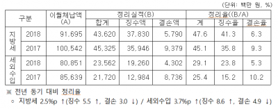 9월 말 현재, 체납정리실적은 전년 동기 대비 지방세는 2.5%p 증가, 세외수입은 3.7%p 증가하는 등 전년도 보다 상회하는 실적으로 연말까지 더 높은 우수한 실적을 기대하고 있다.