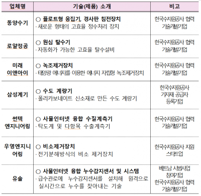 이들 기업은 한국수자원공사의 댐과 정수장을 성능시험장로 활용해 제품을 개발하거나 공사에서 중소기업 지원을 위해 추진하는 각종 협업과제, 시범사업 등에 참여하고 있다.
