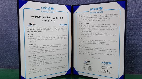 [충청뉴스큐] 제주특별자치도는 지난 7일 유니세프 한국위원회와 아동친화도시 조성을 위한 업무협약을 체결했다고 밝혔다.