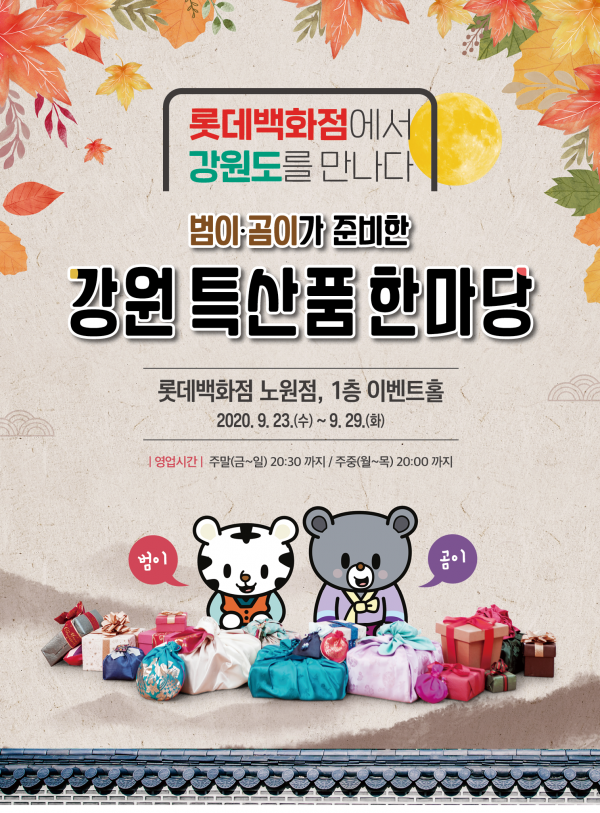 [충청뉴스큐] 강원도는 추석을 맞아 롯데백화점과 공동으로‘강원 특산물 한마당’을 오는 9. 23.부터 롯데백화점 노원점에서 개최한다고 밝혔다.