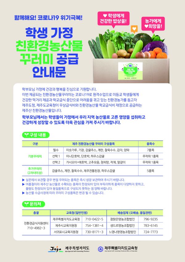 친환경농산물 꾸러미 공급 사업은 학생의 건강 증진과 친환경농산물 생산 농가에 도움을 주고자 제주도와 도교육청간의 업무협의를 거쳐 미 사용된 급식비 7억 5천여만원을 투입해 학생들의 가정으로 신선한 제주지역 친환경농산물과 가공품으로 구성된 꾸러미를 배송한 사업이다.