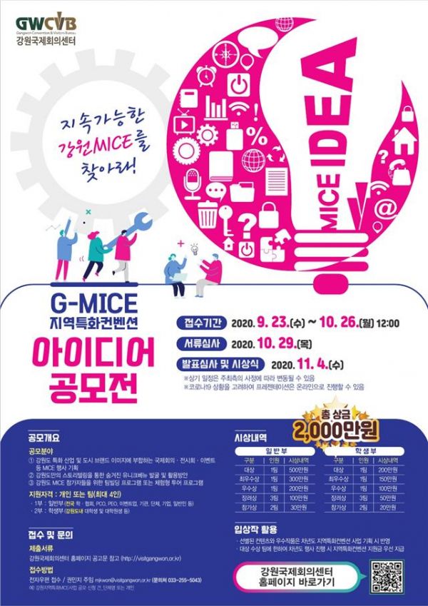 [충청뉴스큐] 강원국제회의센터는 강원지역 MICE산업의 지속가능한 강원형 지역특화컨벤션 육성과 미래 MICE 인재의 역량 강화를 위해 ‘2020 G-MICE 지역특화 아이디어 공모전’을 개최한다.