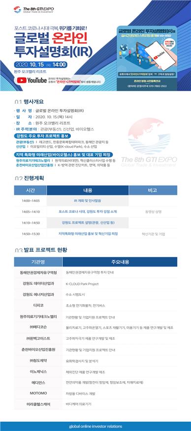 [충청뉴스큐] 강원도는 코로나 팬데믹으로 위축된 경기와 투자심리에 온기를 불어넣을 ‘글로벌 온라인 투자설명회’를 오는 10월 15일 원주 오크밸리 리조트에서 개최되는 제8회 GTI 국제 무역·투자박람회에서 비대면으로 실시한다.