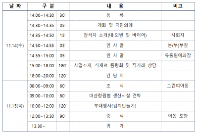 주요 내용은 강원도에서 생산·가공되는 농특산물 우수 식재료 에 대한 식재료 품평회, 전시·상담부스를 통한 바이어 구매 상담, 대관령원예농협의 전처리·가공시설 견학으로 산지에 대한 이해도를 증진시키고, 부대행사로 김치만들기 체험도 실시할 계획이다.