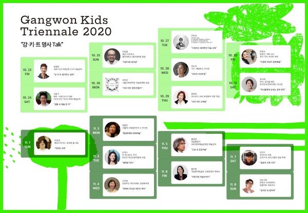 ‘강·키·트 명사 톡’에서는 한젬마 예술감독이 어린이 미술, 창의교육 등 참여명사들과 함께 평소 관심 분야의 이야기를 통한 정보 및 노하우를 전달한다.
