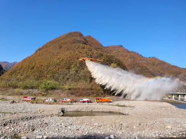 이날 산불헬기진화훈련은 삼척시 신기면 지역의 경우 담수지가 원거리인 광동댐에 위치함에 따라 대형산불발생시 초동진화가 어려움에 있어, 금년 10월경 가동보를 삼척시 신기면 일원에 조성했다.
