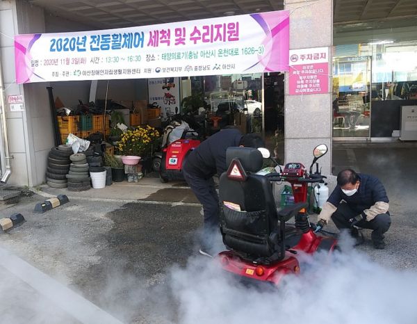 [충청뉴스큐] 아산장애인자립생활지원센터가 지난 3일 전동휠체어 세척클리닉 서비스를 진행했다.