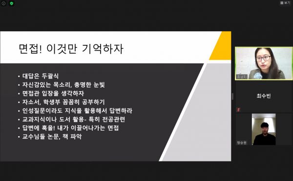 1부 온라인 대입면접의 이해, 2부 전문컨설턴트와의 개별 모의면접을 통해 코로나19로 대학면접 방법이 온라인으로 바뀌면서 입시준비에 어려움을 겪고 있는 아산시 청소년을 위한 면접컨설팅 시간을 가졌다.