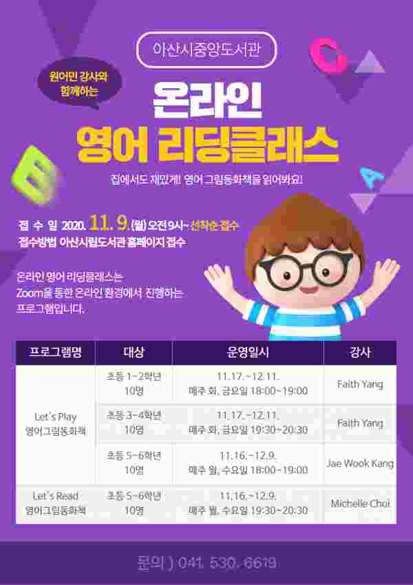 [충청뉴스큐] 아산시립도서관이 오는 16일부터 초등학생 40명을 대상으로 ‘온라인 영어 리딩 클래스’를 진행한다.