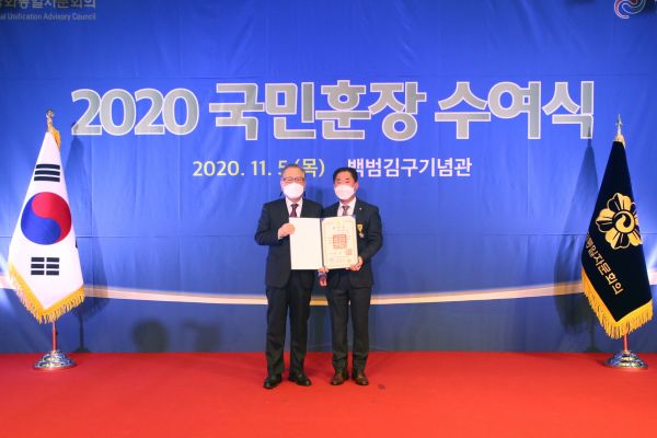 [충청뉴스큐] 민주평화통일자문회의 충남지역회의 김인배 간사가 최근 백범기념관에서 열린 ‘2020년 민주평통 국민훈장 수여식’에서 평화통일 기반구축과 지역사회 발전에 기여한 공로로 국민훈장 목련장을 받았다.