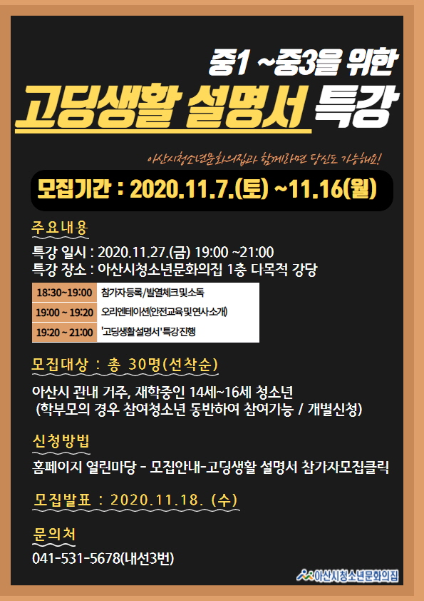 [충청뉴스큐] 아산시청소년문화의집이 진로코칭센터사업의 일환으로 진로진학교육지원 ‘고딩 생활 설명서’ 특강을 진행한다.
