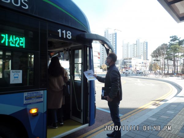 이에 시는 지난 10일과 11일 2일에 걸쳐 시내버스, 택시운수종사자, 이용객을 대상으로 올바른 마스크 착용에 대한 홍보물을 배부하며 마스크 착용에 대한 계도활동을 펼쳤다.