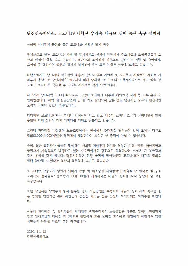 서해안 관광도시인 당진시의 이미지 손상 및 회복중인 지역상권이 위축될 수 있다는 점 등을 고려해 19일 개최하려는 집회를 즉각 중단하고 현대제철 및 협력사들과 현대제철 비정규직지회 노동조합은 단체교섭과 대화를 적극적으로 진행해 모든 문제를 조속하고 원만하게 해결해 당진 시민들의 안전을 확보해 달라고 촉구했다.