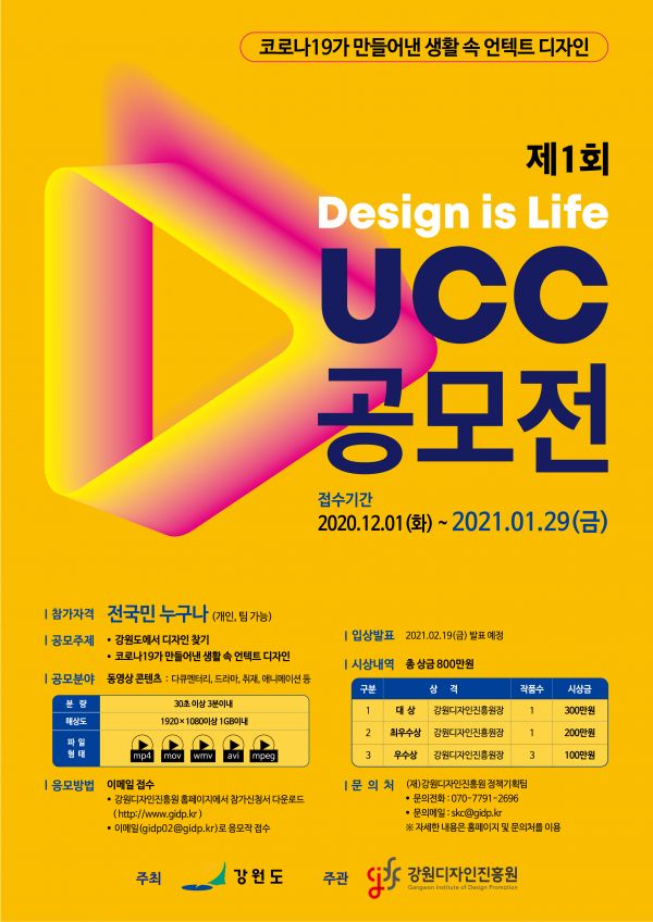 [충청뉴스큐] 강원디자인진흥원은 제1회 ‘Design is Life’ UCC공모전을 오는 12월 1일부터 내년 1월 29일까지 개최한다.