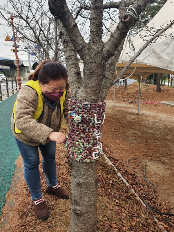 [충청뉴스큐] 아산시가 7일 신정호 자전거길 300그루 나무에 ‘업싸이클링 뜨개나무옷’을 입혔다.