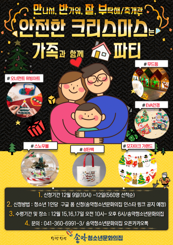 당초 송악청소년문화의집 개관에 맞춰 관내 아파트를 찾아가 체험부스 형식으로 진행해 청소년들에게 다양한 체험기회를 제공하고 신규 청소년수련시설인 송악청소년문화의집을 홍보할 예정이었으나 코로나 확산으로 인해 비대면 프로그램으로 대체 실시한다.