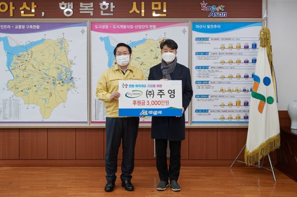 [충청뉴스큐] ㈜주영(대표이사 김태수, 음봉면)이 지난 7일 아산시(시장 오세현)를 방문해 취약계층 지원을 위한 성금 3000만원을 기부했다.