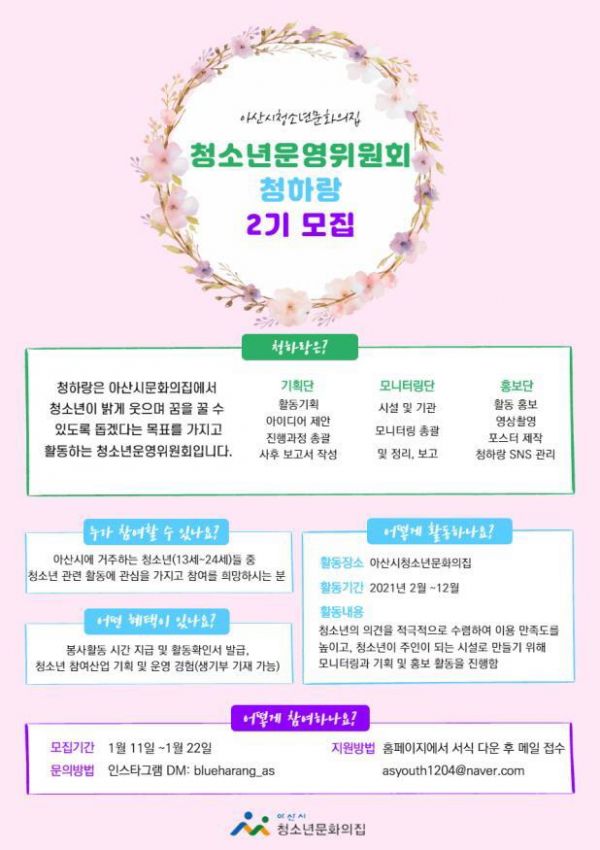 [충청뉴스큐] 아산시청소년문화의집이 오는 22일까지 ‘2021년 청소년운영위원회 청하랑’과 함께할 위원을 모집한다.