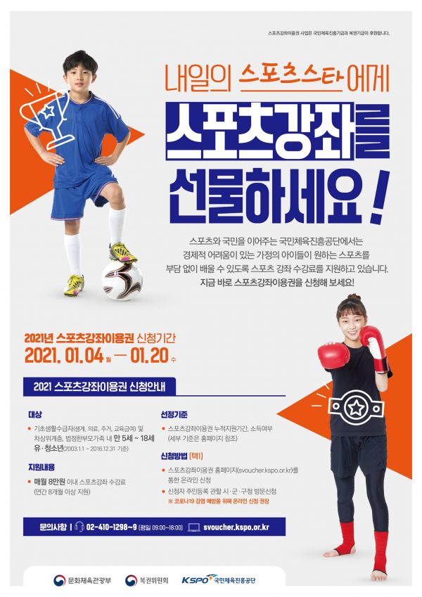 스포츠강좌이용권 지원사업은 월 8만원 범위 내의 스포츠강좌 수강료를 지원하는 사업으로 취약계층 유·청소년의 건전한 여가활동을 통한 삶의 질 향상에 기여하고 있다.