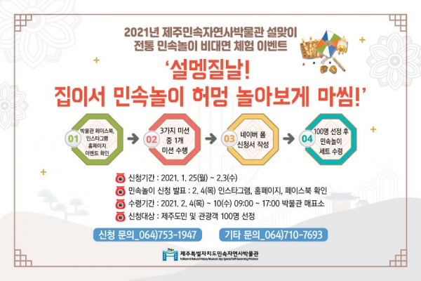 [충청뉴스큐] 제주특별자치도 민속자연사박물관은 2021년 설 연휴 기간 동안 ‘2021년 설맞이 민속놀이 체험프로그램’을 비대면으로 운영한다고 밝혔다.