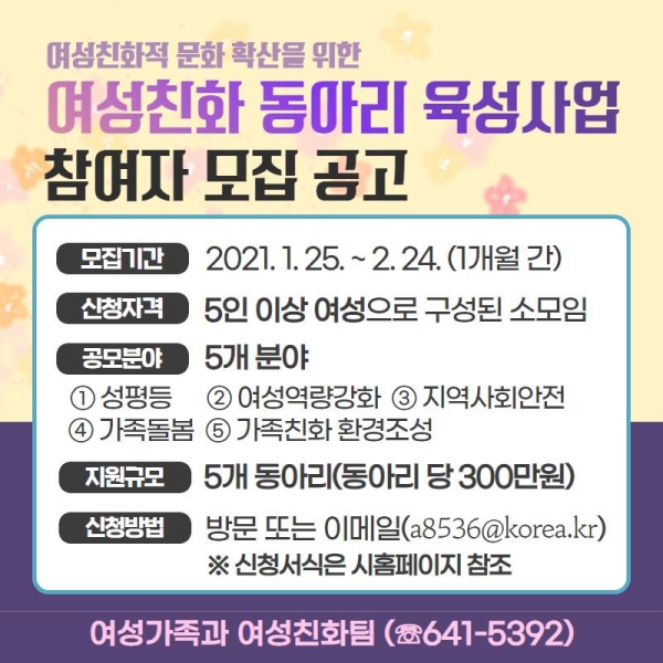 공모분야는 성평등 분야 여성역량강화 분야 지역사회 안전 분야 가족 돌봄 분야 가족친화 환경조성분야 등 총 5개 분야이다.