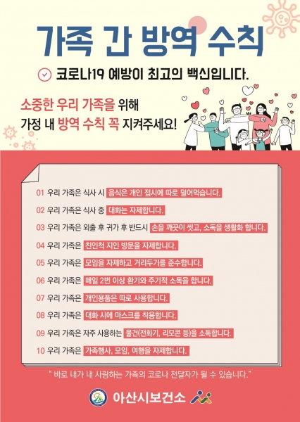 [충청뉴스큐] 아산시가 코로나19 가족 간 감염 증가에 따라 시민들이 가정에서 지킬 수 있는 방역 수칙 홍보에 나섰다.