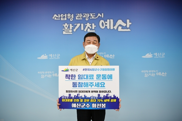[충청뉴스큐] 황선봉 예산군수는 1월 28일 코로나19로 어려움을 겪는 소상공인 자영업자를 위해 전국시장군수구청장협의회가 중심이 돼 추진 중인 ‘착한 임대료 확산 챌린지’에 동참했다.