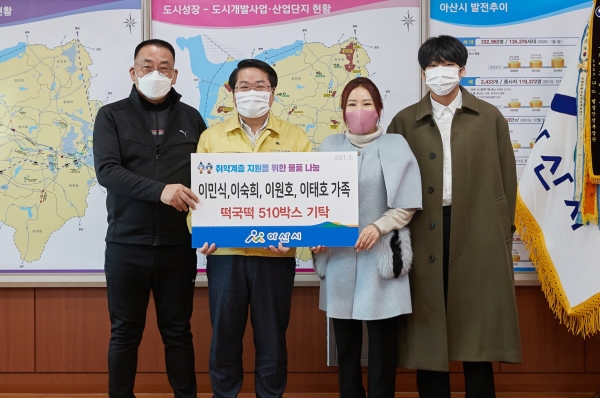[충청뉴스큐] 이민식·이숙희·이원호·이태호 가족이 4일 아산시를 방문해 취약계층 지원을 위한 떡국 떡 510상자를 전달했다.