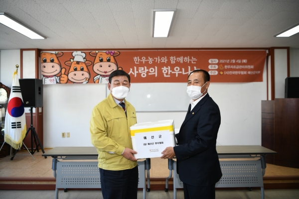 [충청뉴스큐] 전국한우협회 예산군지부는 4일 설 명절을 앞두고 코로나19로 어려움을 겪는 어려운 이웃들을 위해 시가 370만원 상당의 한우 국거리 100㎏ 나눔 행사를 예산군 축산회관에서 비대면으로 진행했다.