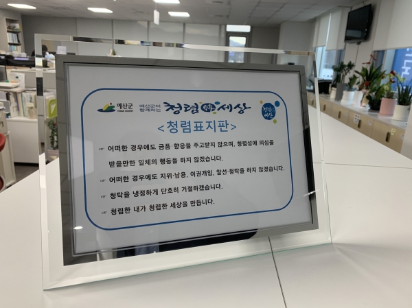 [충청뉴스큐] 예산군이 부정부패 근절 및 청렴한 조직문화 조성을 위한 반부패 청렴활동 강화의 일환으로 청렴표지판을 제작해 각 부서에 부착했다.