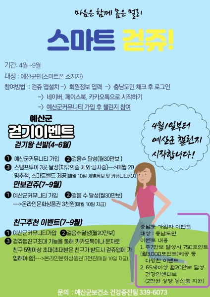 [충청뉴스큐] 예산군보건소는 군민 건강증진을 위한 ‘스마트 걷쥬’ 프로그램을 4월 1일부터 재개한다.