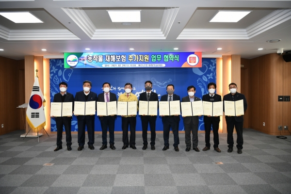 [충청뉴스큐] 예산군과 관내 농협은 지난 24일 군청 대회의실에서 황선봉 군수와 농협중앙회 예산군지부장, 지역농협 조합장이 참석한 가운데 농작물재해보험 추가 지원 업무 협약식을 가졌다.