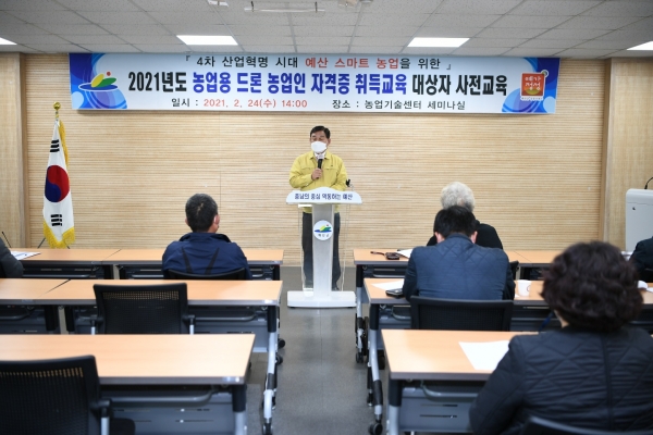 [충청뉴스큐] 예산군농업기술센터는 지난 24일 농업기술센터 세미나실에서 농업인 20명을 대상으로 ‘농업용 드론 농업인 자격증 취득 사전교육’을 실시했다.