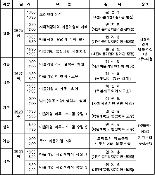 교육은 오는 24일, 27일에는 사회적경제협동의집 1층 커뮤니티홀에서 오는 29일, 30일에는 대전광역시NGO지원센터 모여서50홀에서 오전 10시부터 오후 5시30분까지 각각 진행된다.