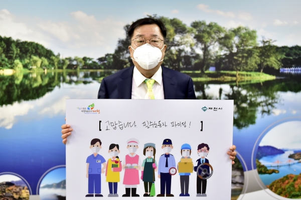[충청뉴스큐] 이상천 제천시장이 지난 24일 코로나19 상황에서도 국민의 생명과 신체를 보호하고 사회기능 유지를 위해 대면 업무가 불가피한 필수노동자를 응원하는 ‘고맙습니다 필수노동자’ 캠페인에 동참했다.