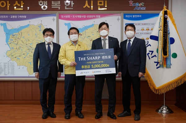 [충청뉴스큐] ㈜포스코건설 더샵 센트로가 지난 3월 31일 아산시를 방문해 취약계층 지원을 위한 성금 500만원을 후원했다.