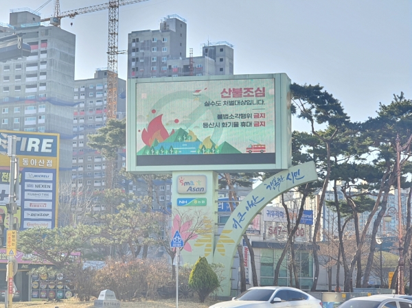 이에 아산시는 관내 산불취약지역 약 1만여 세대에 생활정보 홍보우편을 발송하고 아산시 SNS 및 전광판 3개소, 시내버스 약 48대를 활용한 광고 등을 통해 입산 시 인화물질 휴대 금지, 논·밭두렁 및 영농부산물 소각행위 금지 등에 대해 집중적인 홍보를 실시하고 있다.