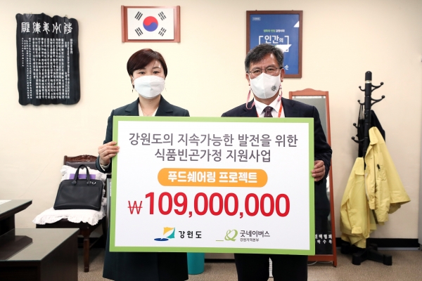 [충청뉴스큐] 굿네이버스 강원본부에서 4월 12일 강원도청에 방문해 1억 9백만원 상당의 식품 빈곤 아동 가정용 키트 및 물품 전달식을 했다.