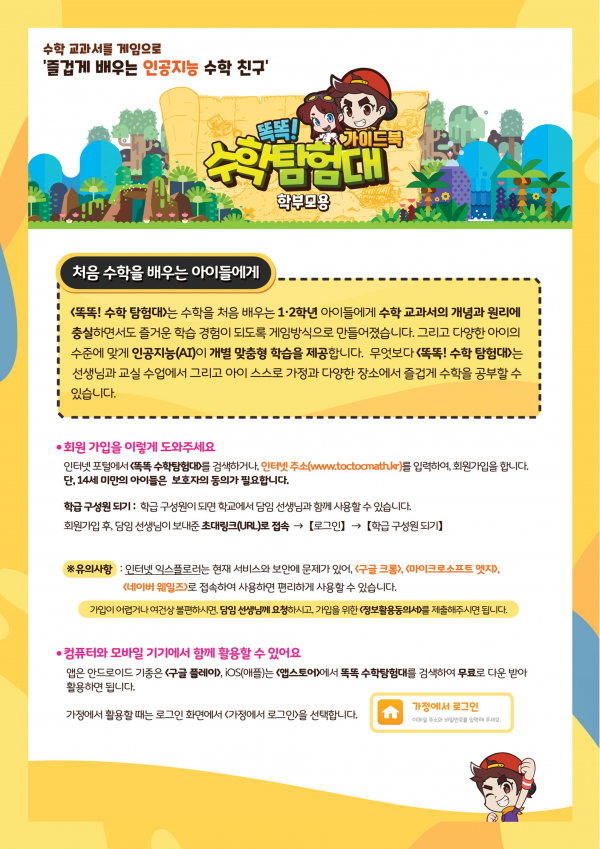 또한, 도교육청은 ‘똑똑 수학탐험대’가정학습 활용 리플릿을 도내 초등학교 1~2학년 학부모에게 제공하고 학부모들은 이를 통해 시스템 가입 및 활용방법, 온라인 학습 내용을 확인할 수 있다.