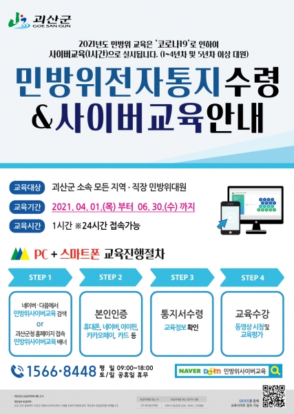 [충청뉴스큐] 충북 괴산군은 코로나19의 확산 방지를 위해 지난해에 이어 올해도 지역 내 거주하는 민방위 전체 대원을 대상으로 민방위 사이버 교육을 실시한다고 19일 밝혔다.