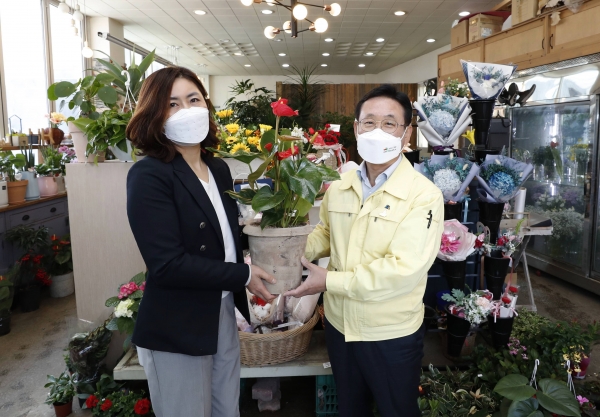 이 군수는 지난 20일에도 매주 화요일 꽃을 구매해 집이나 사무실에 장식하거나 지인에게 선물하는 ‘꽃같은 화요일’에 다시 한 번 동참하고 소상공인의 애로사항을 청취하는 시간을 가졌다.