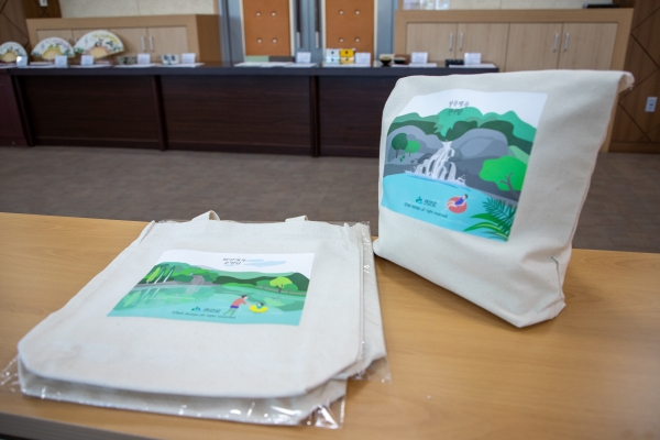 힐링 괴산_에코백은 괴산의 명소인 산막이옛길, 쌍곡계곡, 화양계곡, 수옥정의 아름다운 풍경을 일상에 담아가도록 실용적인 에코백에 그림을 그려 넣어 만든 것이다.