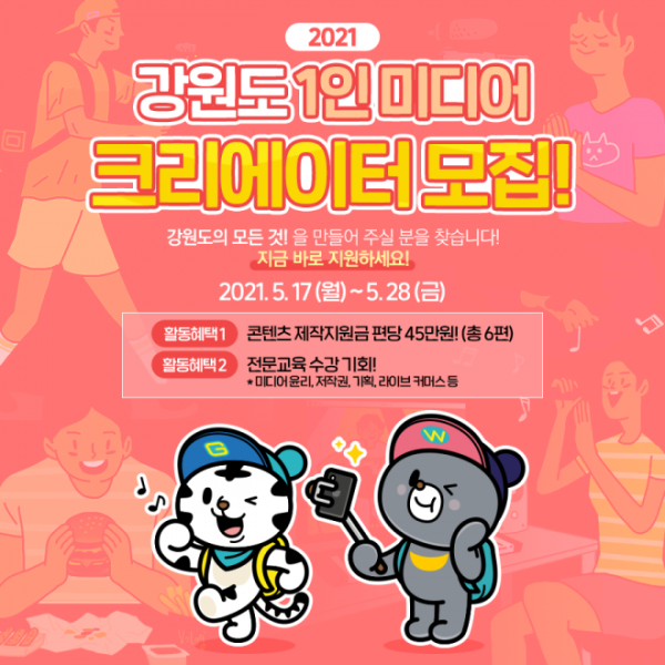 2021년 강원도 1인 미디어 크리에이터는 강원도를 주제로 한 영상 콘텐츠를 창작할 수 있는 사람은 누구나 지원할 수 있으며 개인 또는 팀 단위로 총 20팀을 선발할 예정이다.