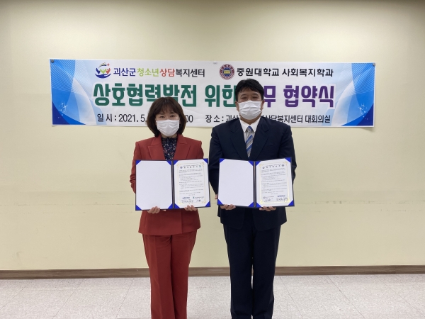 [충청뉴스큐] 충북 괴산군청소년상담복지센터·학교밖청소년지원센터는 지난 10일 중원대학교 사회복지학과와 상호협력 체계 구축을 위한 업무 협약식을 가졌다.