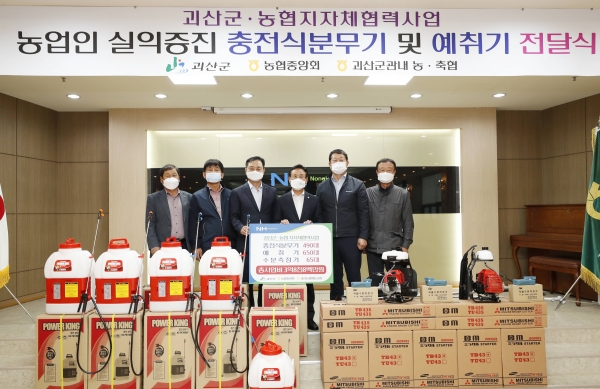 [충청뉴스큐] 충북 괴산군은 지난 10일 괴산농협예식장 3층에서 관내 농가지원을 위한 ‘괴산군농협 지자체 협력사업 농기계 전달식’을 가졌다.